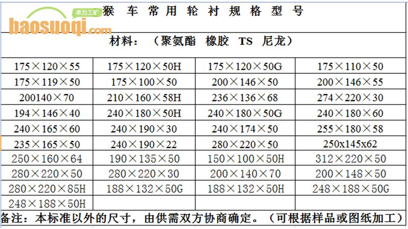 橡膠材質(zhì)居中多,因其材質(zhì)較軟,乘坐舒適度高;聚胺酯材料輪襯耐磨性較橡膠更優(yōu)且舒適度也很高,但因原材料太貴,經(jīng)濟(jì)性稍差;工程塑料材質(zhì)耐磨性最優(yōu),但硬度較高,乘坐舒適度偏低,故只適應(yīng)于變坡點(diǎn),及對(duì)輪襯耐磨要求極高的工況環(huán)境;三種材質(zhì)各有優(yōu)勢,使用單位可根據(jù)需要自行選擇。