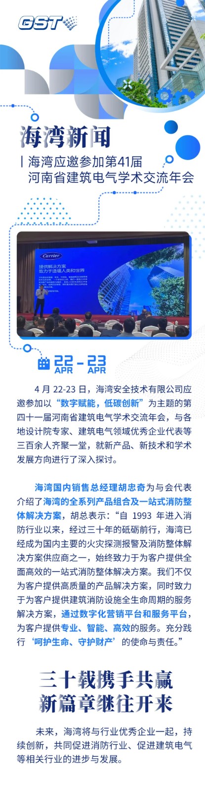 4 月 22-23 日,山西山西山西海灣安全技術有限公司應邀參加以“數字賦能,低碳創(chuàng)新”為主題的第四十一屆河南省建筑電氣學術交流年會,與各地設計院專家、建筑電氣領域 企業(yè)代表等三百余人齊聚一堂,就新產品、新技術和學術發(fā)展方向進行了深入探討。